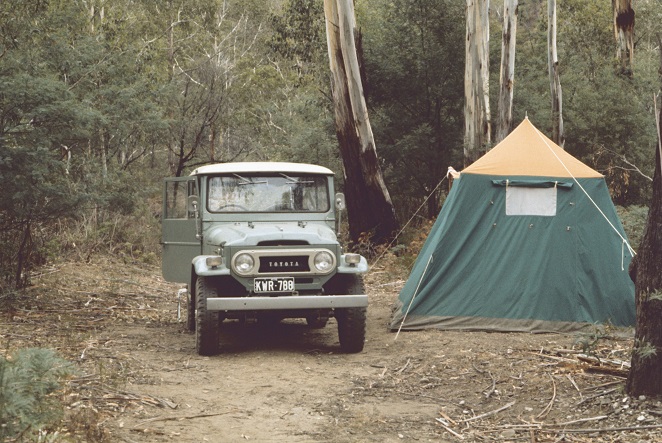 ‘The Alpine National Park stretches from central Gippsland all the way to the New South Wales border where it adjoins Kosciusko National Park. Within the park are some of Australia’s most stunning alpine landscapes, including mountain peaks, escarpments and grassy high plains’ (Parks Victoria brochure). Bon Accord Spur was accessed from a track near the East Branch of the Ovens River. So our visit was at the Northern end of the park. We have previously visited the Alpine National Park on two occasions approaching from Gippsland and making our way to the Wonnangatta Station. It was not a National Park then: but Crown Land and Forrest Commission Land. In 1973 and 1977 when we visited, it was known to a much smaller group of 4 x 4 enthusiasts than it is now. The trip into Wonnangatta from Gippsland was regarded then as challenging, with quite a few river crossings and steep climbing on narrow tracks. It may be more challenging now dealing with the extra traffic and the chopped up tracks and damaged river crossings. Our approach to driving here was cautious: as it was our first real excursion to an out of the way location. We were self-taught 4 x 4 drivers. We did not join a club until late 1998 in South Australia. We walked every river crossing before venturing in! The picture shows that I walked this crossing (a baby one) but I will admit JCD walked more! Here are a few more pictures from the VK5BJE archives.