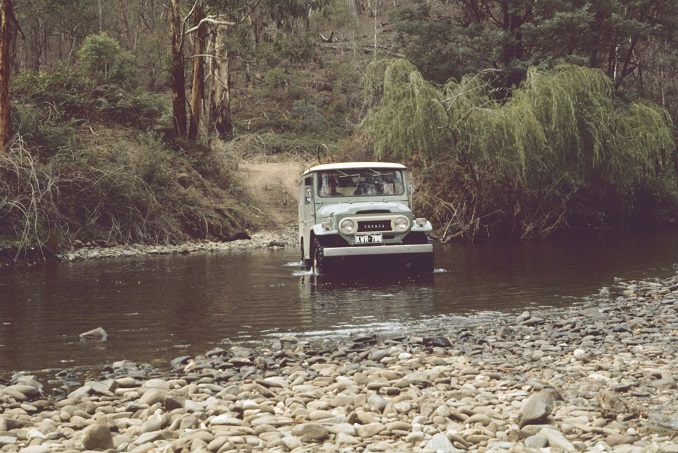 JCD driving our short wheel-base Toyota Land Cruiser across one of many river crossings, March 1973