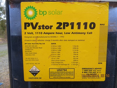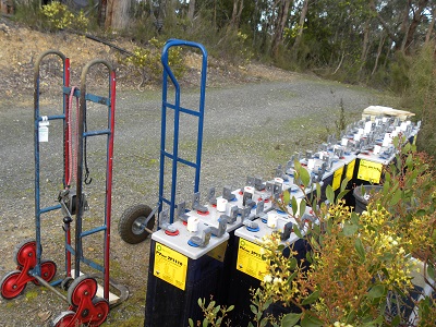 After enjoying a barbecue lunch and no alcohol, removing watches and rings and donning our protective gear: steel-capped boots, safety goggles, old clothes and a sturdy heavy plastic apron I went through the shut down procedure at 14:15 hours. Trevor then disconnected each cell and I moved each cell outside, out of the way, so that at the end of the procedure I could clean the enclosure. The whole process took just over two hours. Each cell weighed (with electrolyte in place) 65 kilograms. They are 690mm high, 210 wide and 147 in length. I used a sack trolley and I noticed at the end of the day that I had been working! I had an early night to prepare to do the whole procedure again on Wednesday morning. I probably would have replaced the cells with the same product if still available. Unfortunately the cells, labelled BP and made by Exide, are no longer manufactured. BP in Australia has left the renewable energy market. The down-side of deep-flooded lead acid cells is that they hold plenty of electrolyte (and thus needed infrequent topping up with distilled water), but they are heavy and it is easy to spill the electrolyte as cells are moved. They are ‘dangerous goods’ and new transport regulations apply to moving them on public roads.