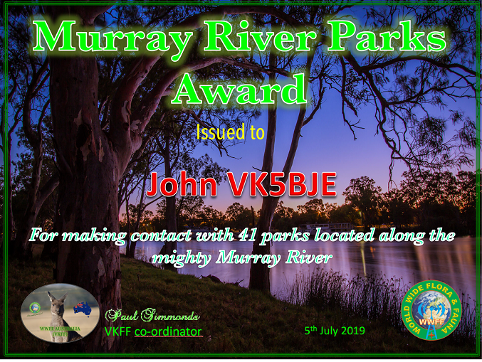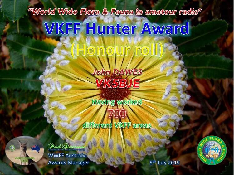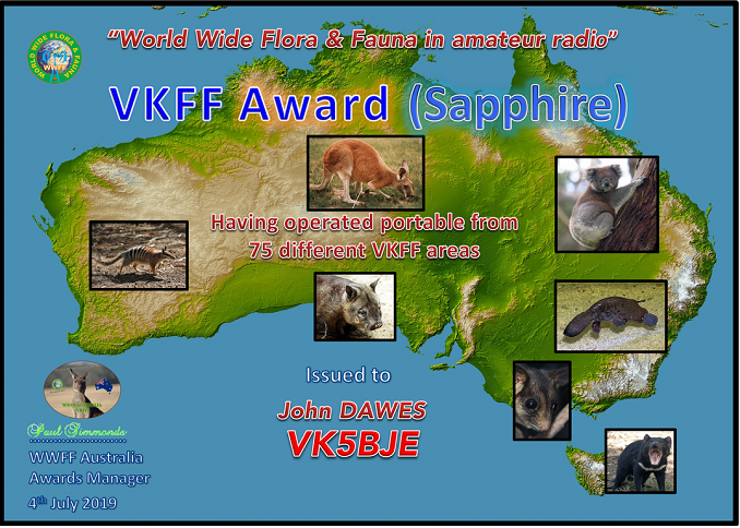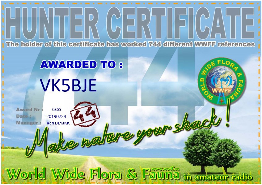 I sent off an application yesterday for this award for working 744 unique references. And the certificate was in my email this morning! I have had a bit of fun ever the last few weeks chasing VK2IO, VK6MB, VK3PF and VK1DI while they have been operating from parks in a variety of states. It has been really good to gain so many new parks. A big thank you to the activators.