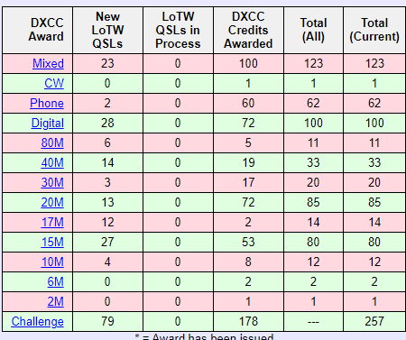 This image from Logbook of the World shows my current totals for all bands I operate. Club Log, which includes all my call signs, shows I now have 142 DX entities/countries confirmed.