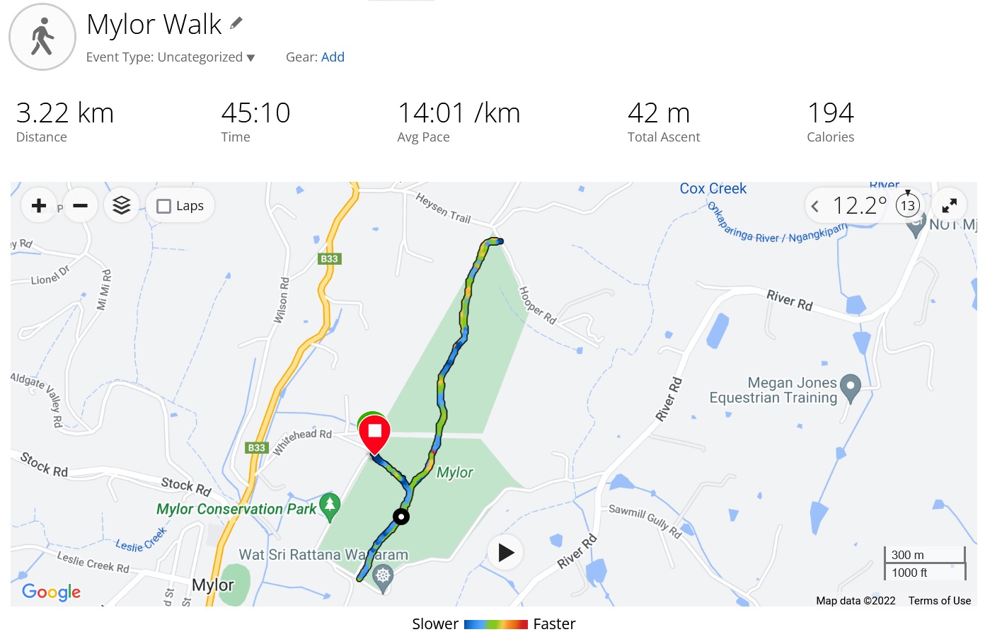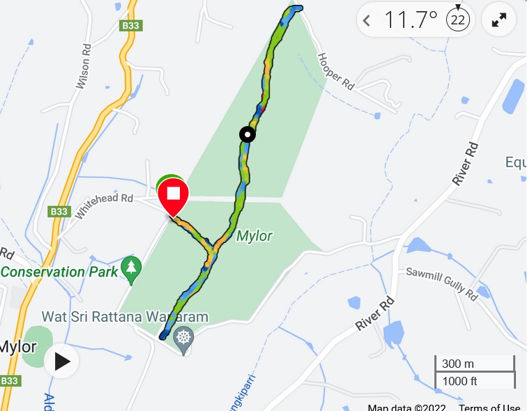 I entered the Park at the Whitehead Road entrance and walked up the hill on Whitehead track to the junction and turned left and walked to the end of the park at Hooper Road. I then re-traced my steps to the southern end of the Park near the entrance to the Thai Forest Monastery. The walk is about three and a half kilometres and took me about 47 minutes, including time out to speak with another walker.