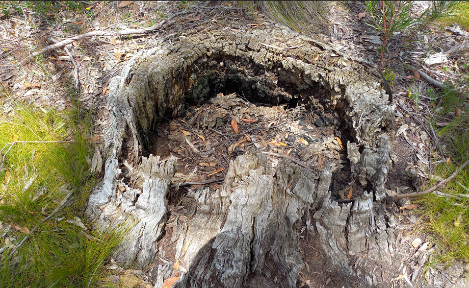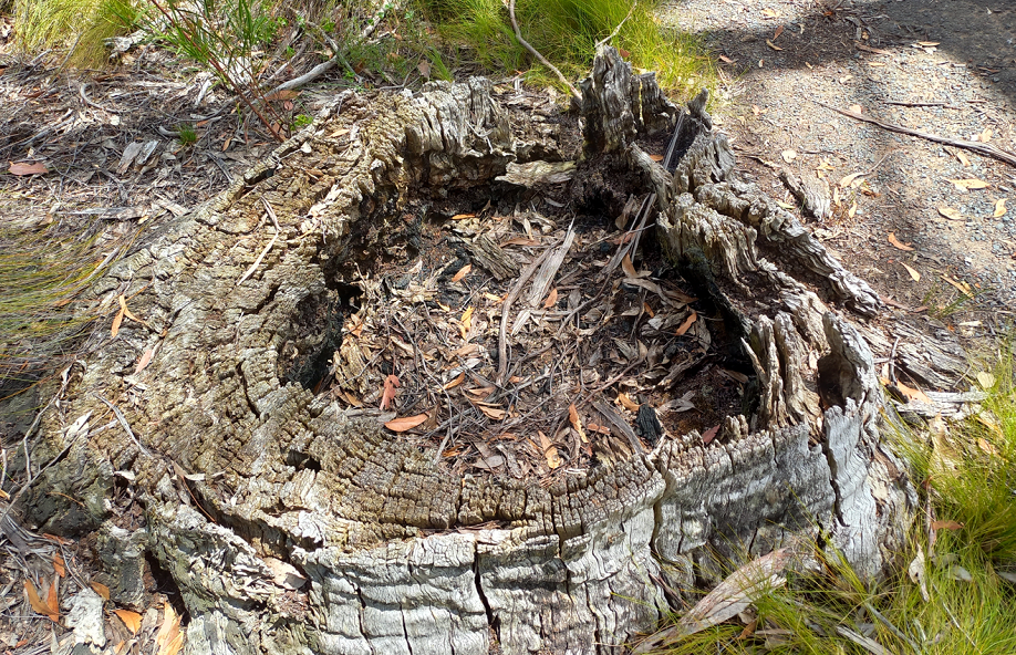 Stringy Bark – stump shows saw marks.Stringy Bark stump – over one metre in diameter and showing saw cuts.
