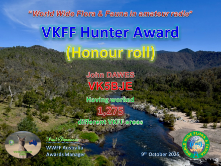I was pleased to receive the VKFF Hunter Award for working 1,275 portable stations participating in the WWFF program. This is a national award and the last 100 or so stations were contacted from my noisy suburban location. I have become an RF junky, learning to ride the RF input control for the clearest signal. At Scott Creek, my previous location, it was set and forget! Working CW stations has also helped build my score. Thanks to all of the activators who make hunting such fun.