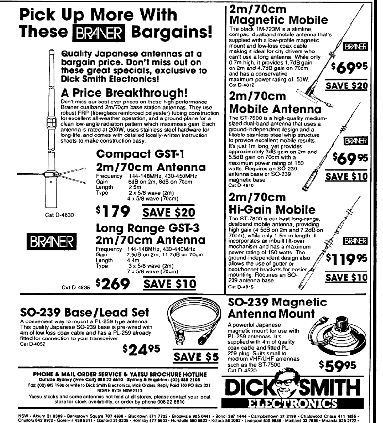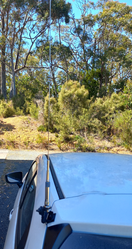 The photo below shows the Brainer antenna mounted on a three-way Diamond Mount. I purchased the Brainer antenna from Dick Smith Electronics (when Dick, VK2DIK, owned the business) probably in the late 1980s or 1990s. I used it on a Suzuki Grand Vitara for many years. I will probably replace it with a Diamond black coloured smaller more stealthy antenna.