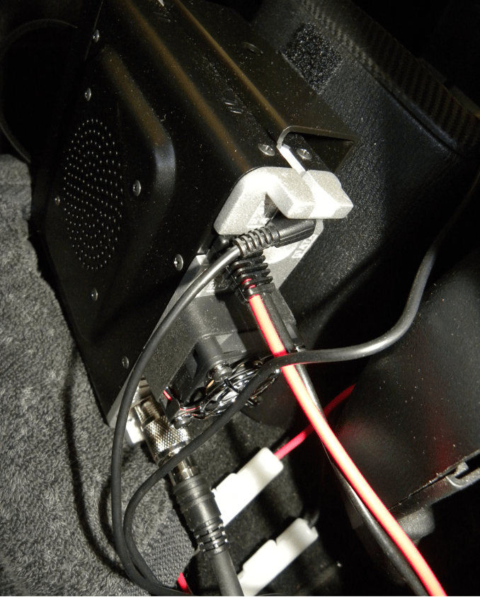 The photo two below shows the radio mounted on the rear of the centre console supported on the hump and the well-engineered mounting bracket is held in place with industrial grade velcro. There is a slight curve in the plastic and I will add some additional velcro to provide a bit more support. Power, speaker and coaxial cables are just visible in this photo. While installing the radio I listened to the WIA broadcast on my FT70D on VK5RDF (two metre repeater) and later on the FTM-300D.