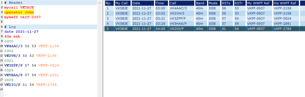 I have reproduced my log below (Fast Log Entry) and appreciate all of the calls, including two park to park contacts with VK3YE/P and VK3PF/P. I appreciate the contacts from all who chased me and those who worked me on two bands, and especially VK5PAS and VK5MAZ who contacted me while mobile, from a mill at Strathalbyn and from their home as well as on 40m and 20m.