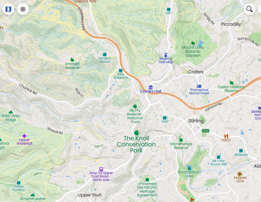 Mount George Conservation Park is one of the Mount Lofty Parks in the Adelaide Hills and is near Bridgewater and adjoins the South Eastern Freeway The map below, courtesy of the Department of Environment and Water, shows the park as two fingers of protected land with private property in between. The South Eastern Freeway is visible at the bottom of the map as are two parking signs. The background is a lighter colour and it is the picnic ground. It is part of the park and dogs are allowed here on leads. I activated within this area and there were very few people in the park. I spoke to one person who wanted to know what I was doing