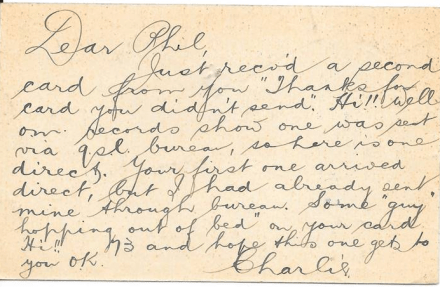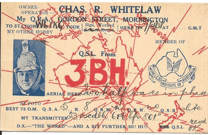 The operator’s name was Charles Whitelaw and the card was sent to W6IKQ. This card and others were sent to Mike from the daughter of one of the Northern California DX Club’s founding members, Felix “Phil” Caldera, W6IKQ. The card was obviously an important confirmation and included the message on the rear side. Note that there is no VK country reference, although the call area number three (3) is included in the call-sign. Mike thought I would like a copy. The card is dated 7th April 1938 just before World War II and just before Australian amateurs were required to shut down their stations. I never met Charles Whitelaw but I suspect that there may still be a few amateurs alive who remember him.